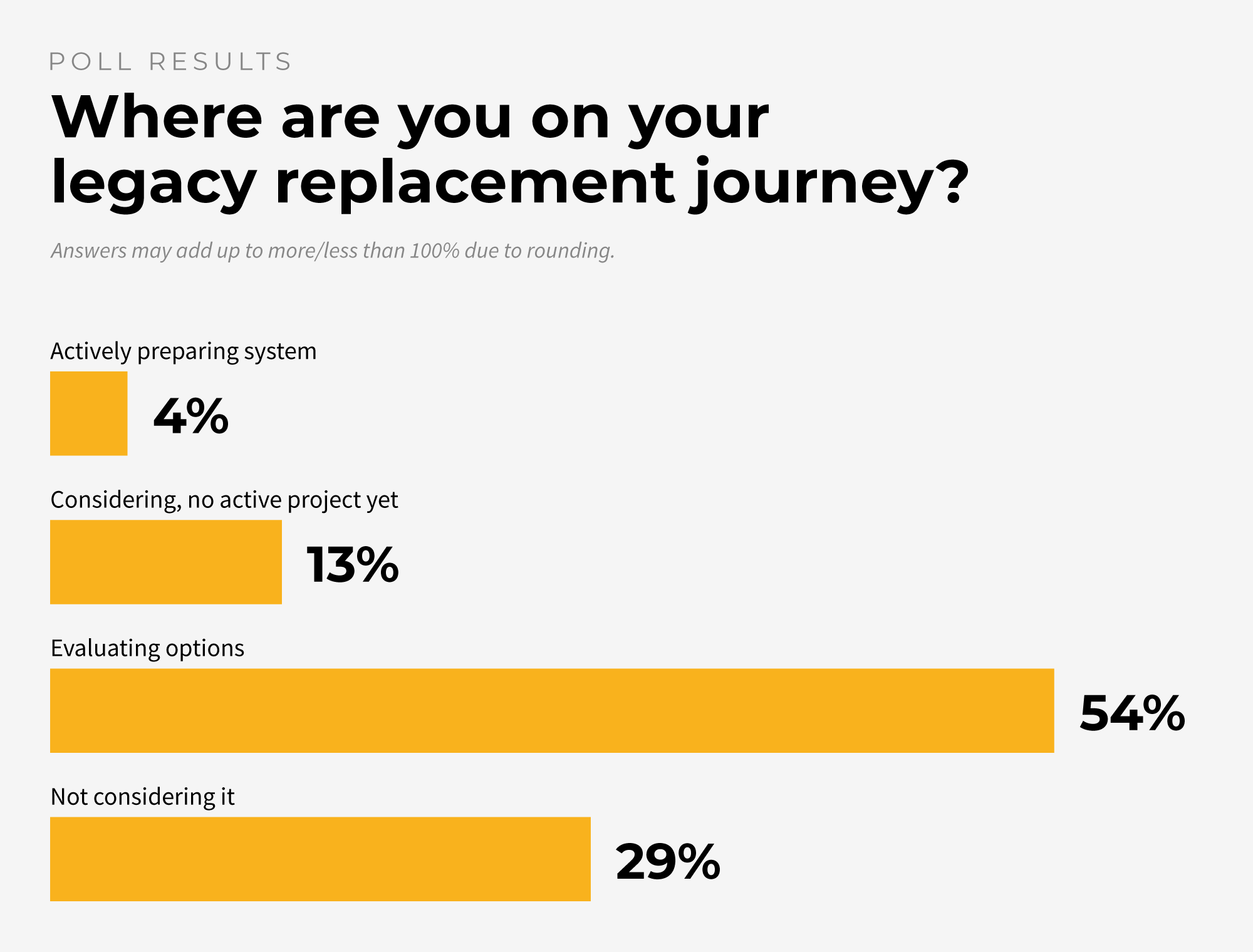 The virtual event was attended by an audience of financial services professionals. Many were actively thinking about replacing their legacy technology, or at least considering it. But 30% of the respondents weren’t considering it at the top of the conversation, so we started the discussion with the reasons why they should.