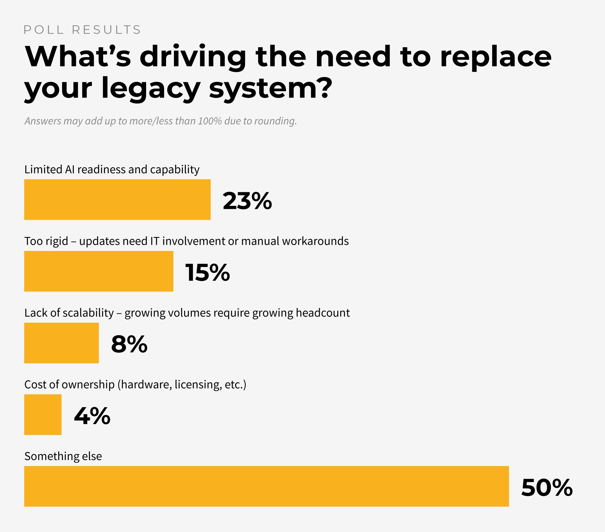 The discussion of AI readiness was timely, given the results of one of our audience polls. While many attendees had ‘other’ reasons driving their desire to get rid of legacy technology, of the options we gave, the fact outdated technology isn’t AI ready was the most common reason, chosen by a quarter of our audience.