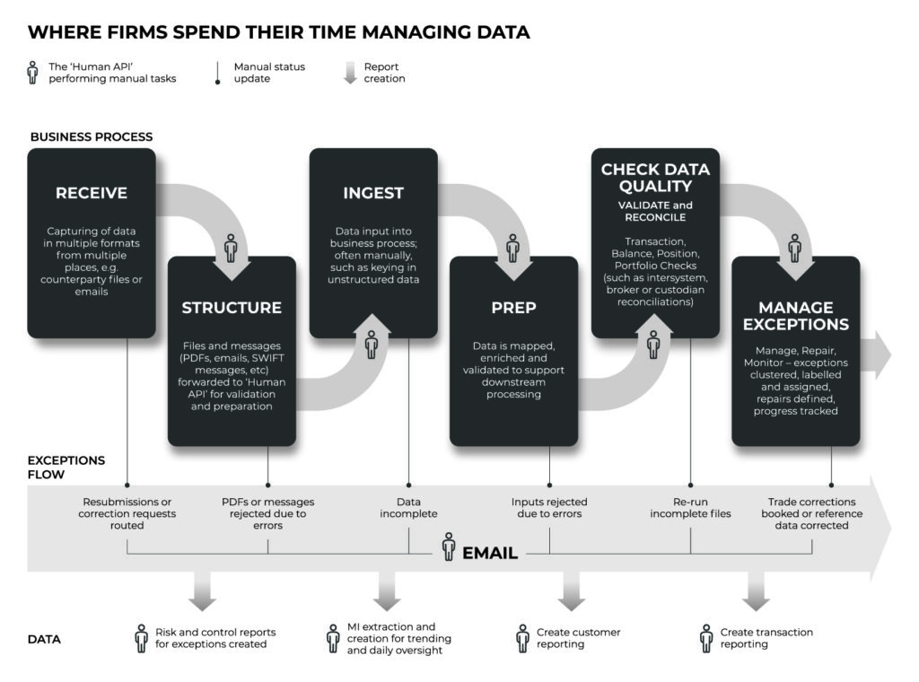 Capital markets firms have traditionally ended up with an operating model built around managing the exceptions caused by bad data. Most firms work on the assumption that bad data is a fact of life and that processes will break. Leading firms have thousands of Operations workers to manually compensate for poor data quality.